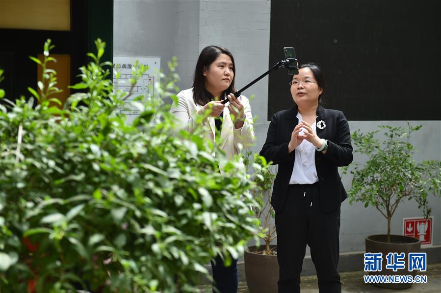 5月16日,老舍纪念馆馆员何婷(右)与主播在直播。 当日,位于北京市的老舍纪念馆举行直播活动,带领网友“云”探馆。记者从北京市文物局获悉,为迎接今年的国际博物馆日,北京市推出了十家名人故居纪念馆系列直播活动,包含北京鲁迅博物馆、老舍纪念馆、詹天佑纪念馆等。 新华社发(陈钟昊 摄)