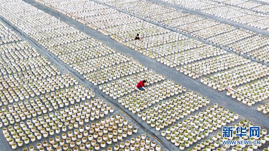 在沭阳县新河镇,杨婷婷(下)在种植基地内整理月季杯苗(5月15日摄,无人机照片)。新华社记者 李博 摄