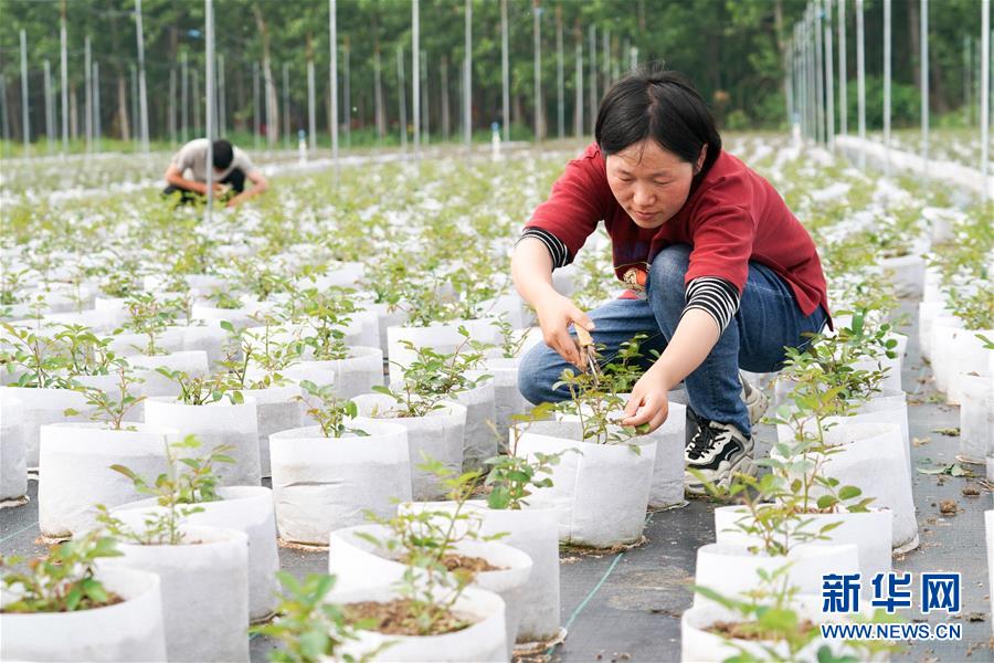 在沭阳县新河镇,杨婷婷在种植基地整理、修剪月季杯苗(5月15日摄)。新华社记者 李博 摄