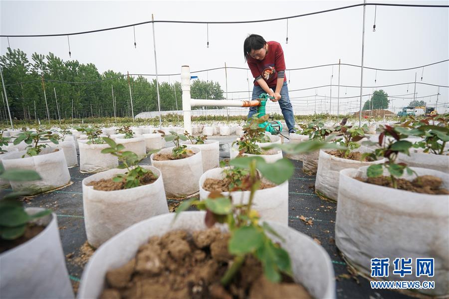 在沭阳县新河镇,杨婷婷在种植基地内打水,准备为月季杯苗浇水(5月15日摄)。新华社记者 季春鹏 摄