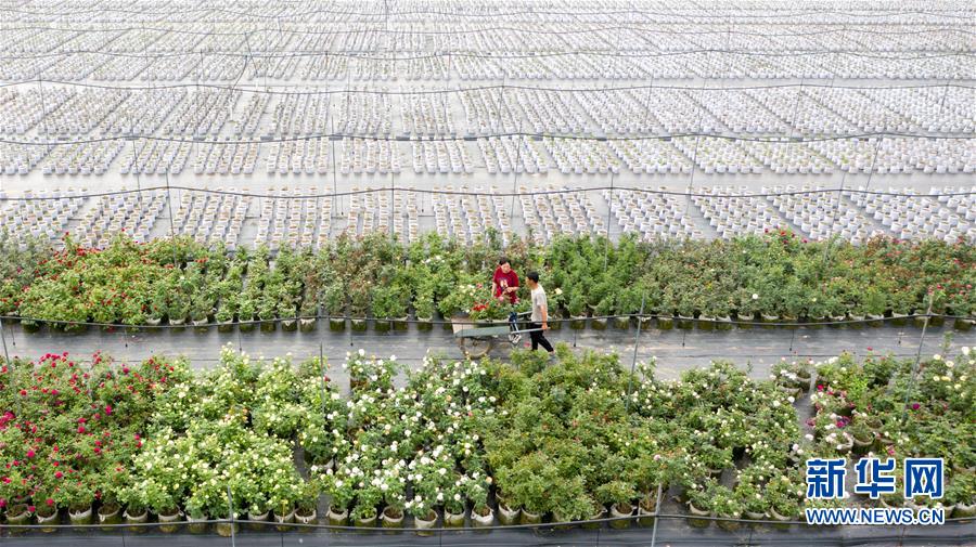 在沭阳县新河镇,杨婷婷(左)和爱人陈武在种植基地内搬运月季花(5月15日摄,无人机照片)。新华社记者 李博 摄