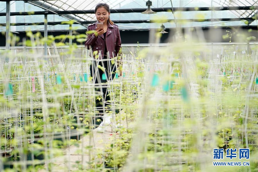 在沭阳县章集街道大沈庄村,赵紫瑄在进行淘宝直播,为粉丝介绍花木养护知识(5月14日摄)。新华社记者 韩瑜庆 摄