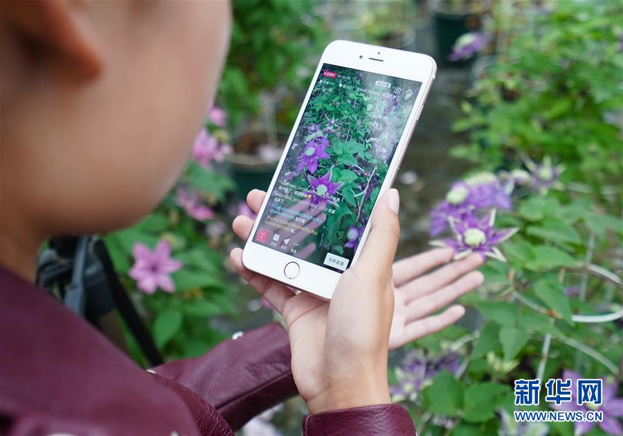 在沭阳县章集街道大沈庄村,赵紫瑄在进行淘宝直播,为粉丝介绍花木养护知识(5月14日摄)。新华社记者 季春鹏 摄