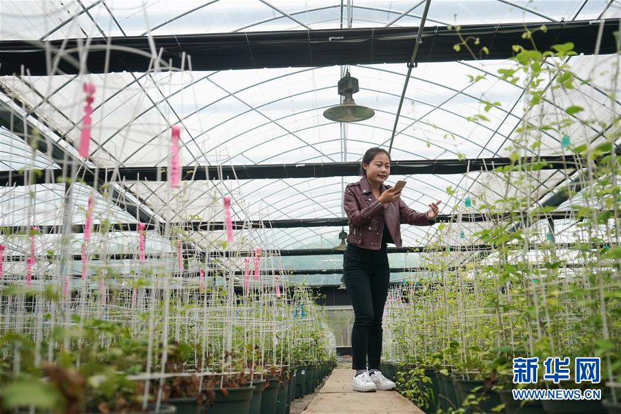 在沭阳县章集街道大沈庄村,赵紫瑄在进行淘宝直播,为粉丝介绍花木养护知识(5月14日摄)。新华社记者 季春鹏 摄