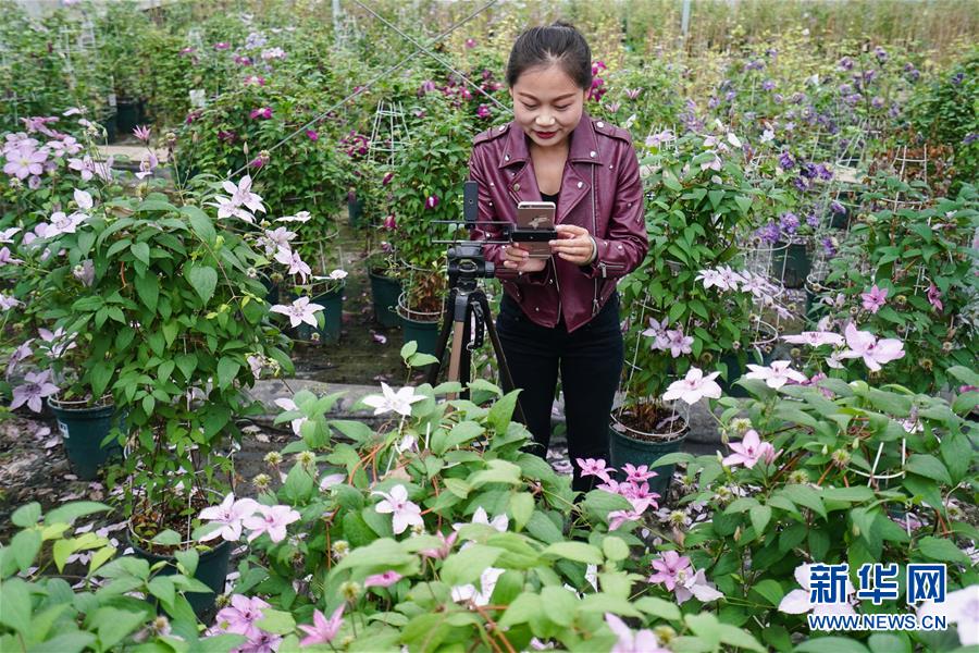 在沭阳县章集街道大沈庄村,赵紫瑄在进行淘宝直播,为粉丝介绍花木养护知识(5月14日摄)。新华社记者 季春鹏 摄