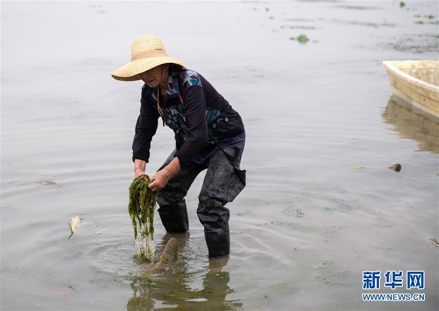 安乡县安丰乡珊珀湖附近村民在清理水中杂草(5月13日摄)。 位于湖南省常德市安乡县安丰乡境内的珊珀湖,是洞庭湖水系一个半封闭型调蓄湖泊,具备蓄洪和灌溉功能,总面积18.3平方公里。过去由于养殖企业投肥投饵,珊珀湖水质长期处于劣五类,湖水观感差,蓝绿藻明显,水体腥臭味严重。 2019年,安乡县有关部门与北京林业大学、湖南中蕾生态科技有限公司、世界自然基金会的科学技术团队展开深度合作,完善了“全面禁投、环湖截污、补水活水、重点清淤、生态修复”五大治理举措,对珊珀湖进行修复。目前,珊珀湖水质和周边环境已有明显好转。 新华社发(陈思汗摄)