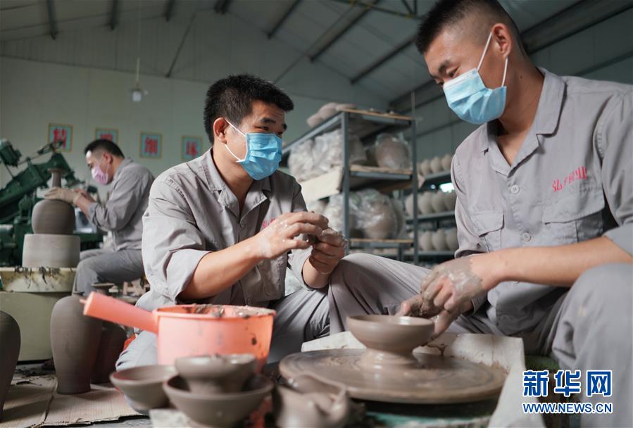 5月16日,耿辉敏(前左)给一名残疾人学员传授邢白瓷制作技艺。新华社记者 朱旭东 摄
