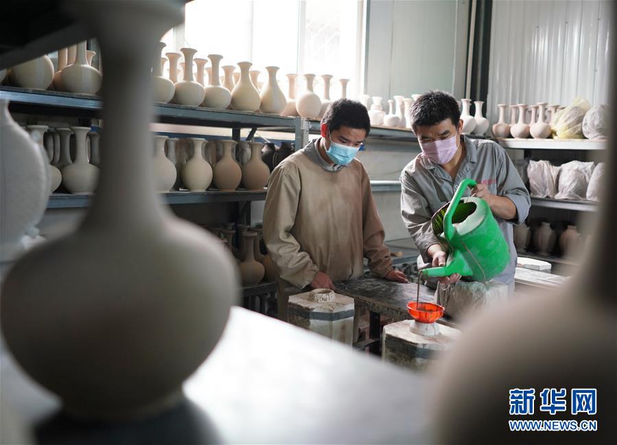 5月16日,耿辉敏(右)给一名残疾人学员传授邢白瓷制作技艺。新华社记者 朱旭东 摄