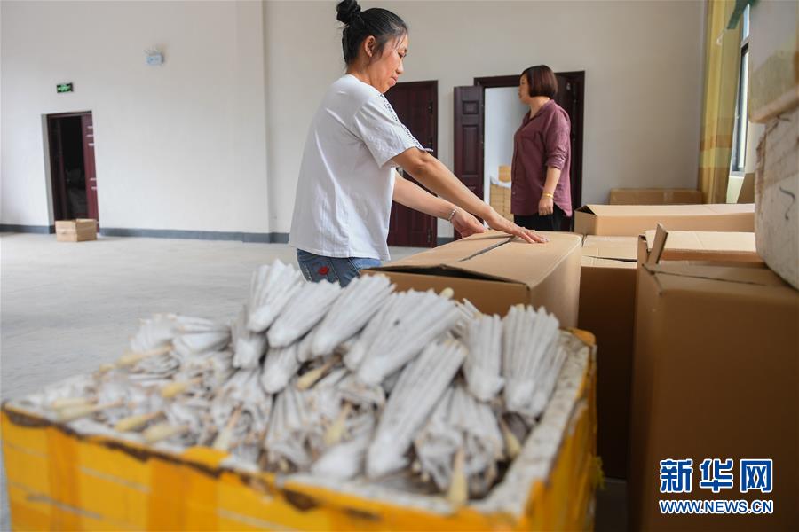 在浏阳市达浒镇椒花新村达兴工艺品厂,村民在整理油纸伞(5月14日摄)。 新华社记者 陈泽国 摄