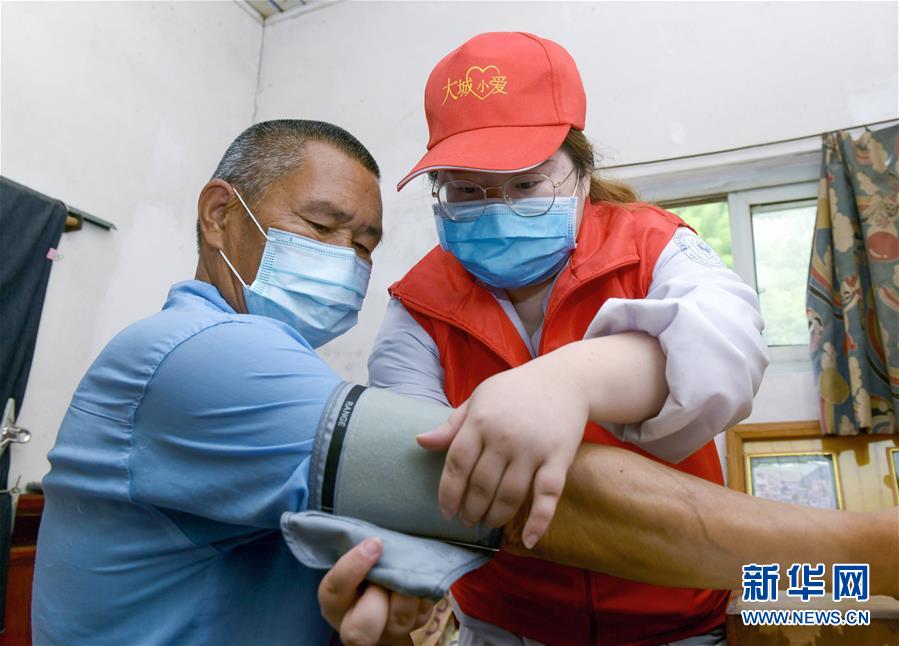 5月17日,在浙江省余姚市陆埠镇杜徐岙村,大城小爱公益服务中心的志愿者为62岁的残疾老人徐陆军进行义诊。新华社记者 徐昱 摄