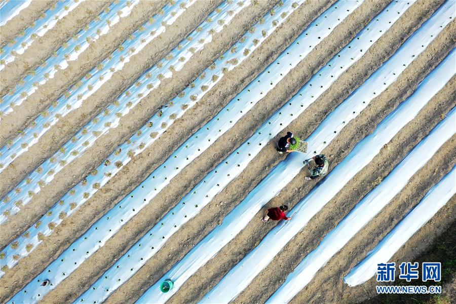 5月14日,齐敏(下)和乡亲们在种植辣椒(无人机照片)。新华社记者 杨文斌 摄