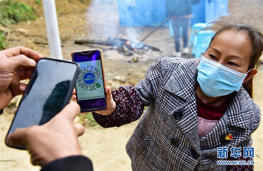 3月6日,在龙里县洗马镇乐宝村后坝组,齐敏在疫情防控执勤卡点执勤时提醒进村人员扫描健康码。新华社发(龙毅 摄)