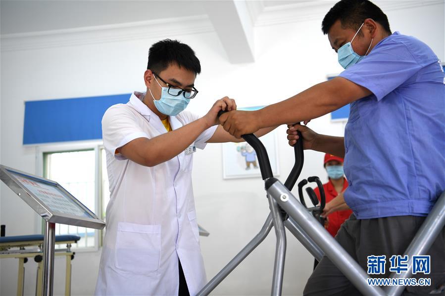 5月17日,医护人员指导花岗镇张店社区残疾人进行肢体训练。 当日是全国助残日,安徽省肥西县花岗镇开展助残日主题活动,邀请医护人员来到张店社区为辖区残疾人免费体检。 新华社记者 刘军喜 摄