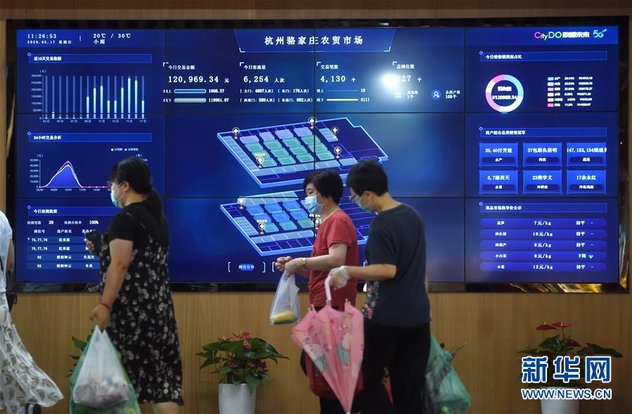 5月17日,骆家庄农贸市场的大屏幕上实时显示交易、客流等相关情况。新华社记者 韩传号 摄