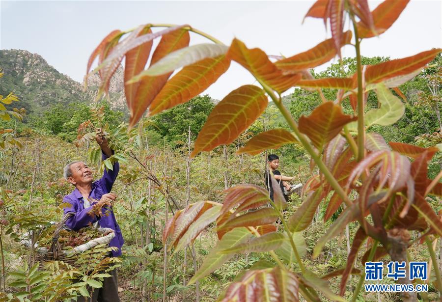 5月17日,秦皇岛市抚宁区王家湾村的村民在自家香椿园采摘香椿芽。 近年来,河北省秦皇岛市抚宁区王家湾村村委会带领村民在坡岭荒地种植红香椿树1000多亩,绿化了荒坡荒地,增加了农民收入。 新华社记者杨世尧摄