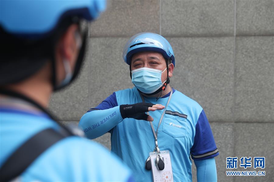5月17日,龚剑华(右)与同事王达鹏使用手语交流。 新华社记者 丁汀 摄