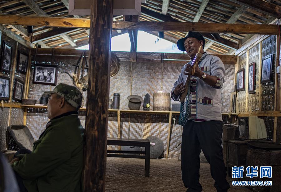 5月17日,61岁的村民和付益(右)在村史馆里弹怒族乐器“达比亚”。 新华社记者 江文耀 摄