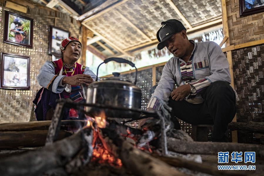 5月17日,61岁的村民和付益(右)与村民加琴在村史馆里的火塘边聊天。 新华社记者 江文耀 摄