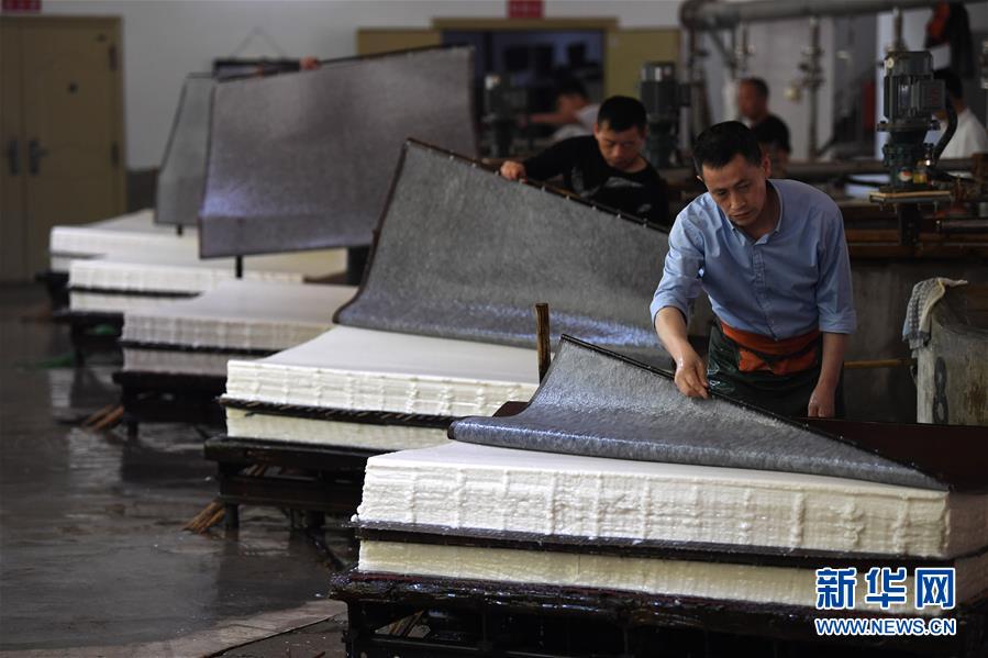 5月11日,安徽省泾县宣纸厂工人在进行捞纸作业。新华社记者 张端 摄