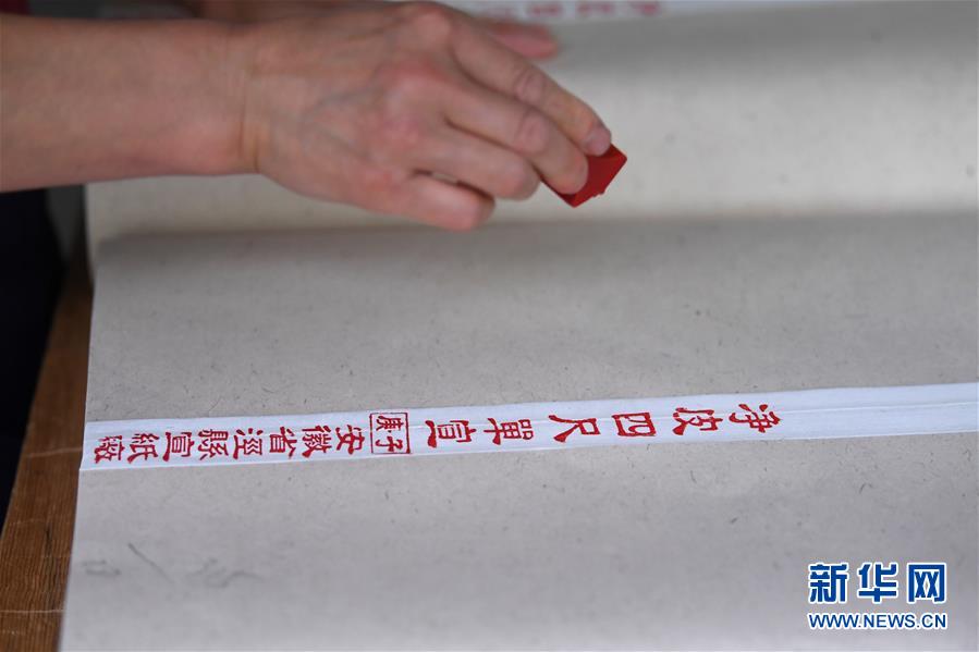 5月11日,安徽省泾县宣纸厂工人为成品宣纸盖上印章。新华社记者 韩晓雨 摄