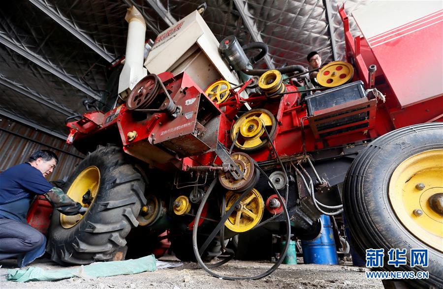 5月17日,在山东青岛市即墨区段泊岚镇东瓦三村,青岛敦欣农机专业合作社技术人员在检修农机,为农民收割小麦做好准备。新华社发(梁孝鹏 摄)