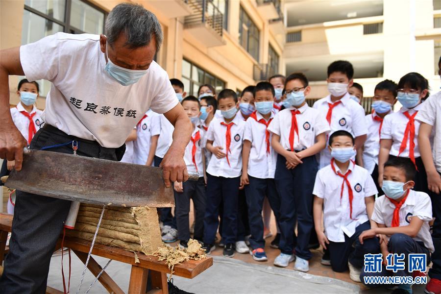 5月18日,在西安高新第六小学,学生们观看西安起良蔡侯纸博物馆工作人员演示造纸技艺。新华社记者 张博文 摄