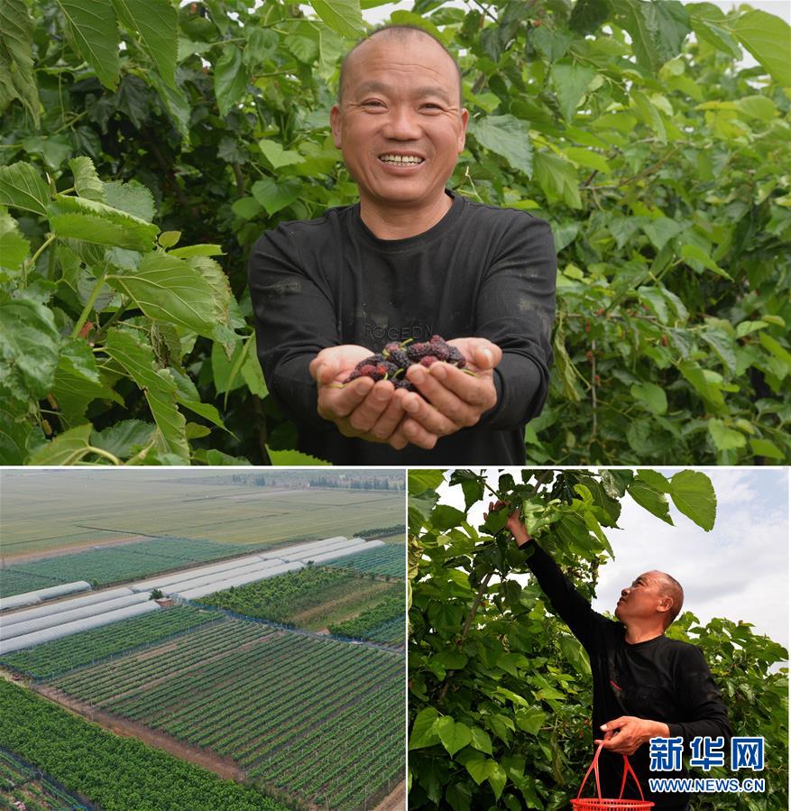 这是一张拼版照片(图片均为5月16日摄)。上图:河南省开封市尉氏县大桥乡十里铺村村民孙根马展示采摘的桑葚;下左图:在扶贫政策扶持下,孙根马流转60多亩土地种植桑葚、葡萄、无花果等(无人机照片);下右图:孙根马在他经营的桑葚种植园内采摘桑葚。新华社记者 孙清清 摄