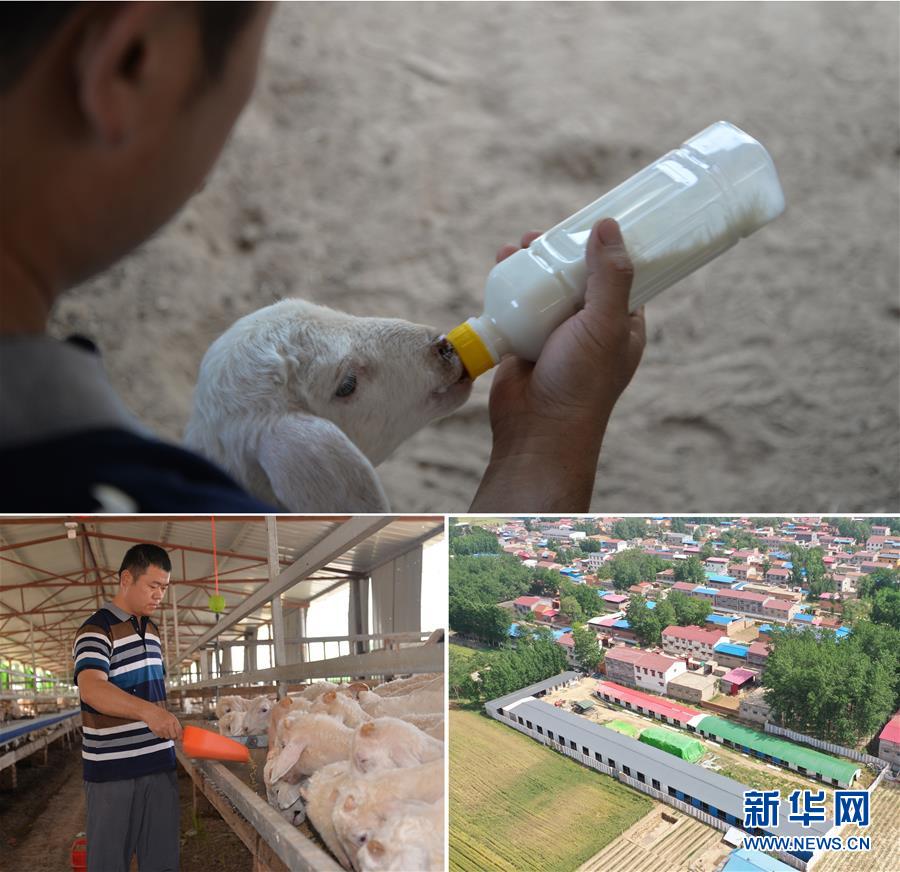 这是一张拼版照片(图片均为5月16日摄)。上图:在河南省开封市尉氏县大桥乡岗刘村,34岁的丁懿军在给小羊喂奶;下左图:丁懿军在给羊喂食;下右图:在扶贫政策扶持下,丁懿军在村头建了占地8亩的羊养殖场,现养羊800多只(无人机照片)。新华社记者 孙清清 摄