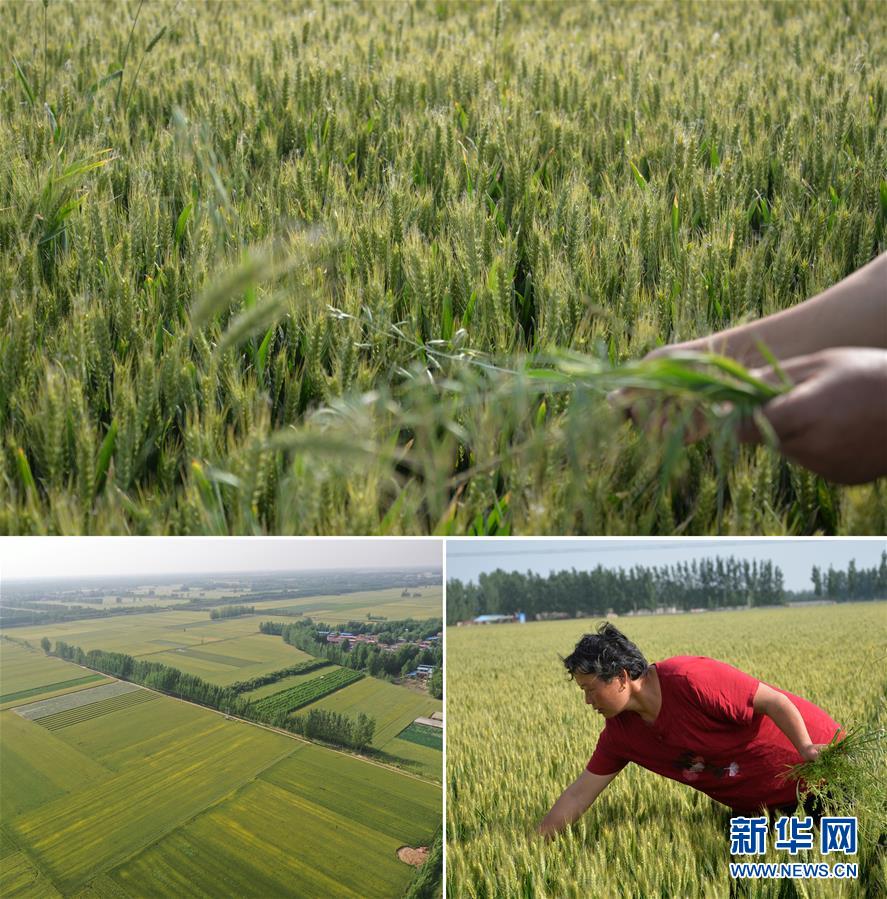 这是一张拼版照片(图片均为5月16日摄)。上图、下右图:在河南省开封市尉氏县十八里镇赵岗村,村民郭菊在麦田内清除杂草。今年她家流转土地种了18亩小麦,长势良好。下左图:尉氏县十八里镇赵岗村附近集中连片的麦田即将迎来收获(无人机照片)。新华社记者 孙清清 摄