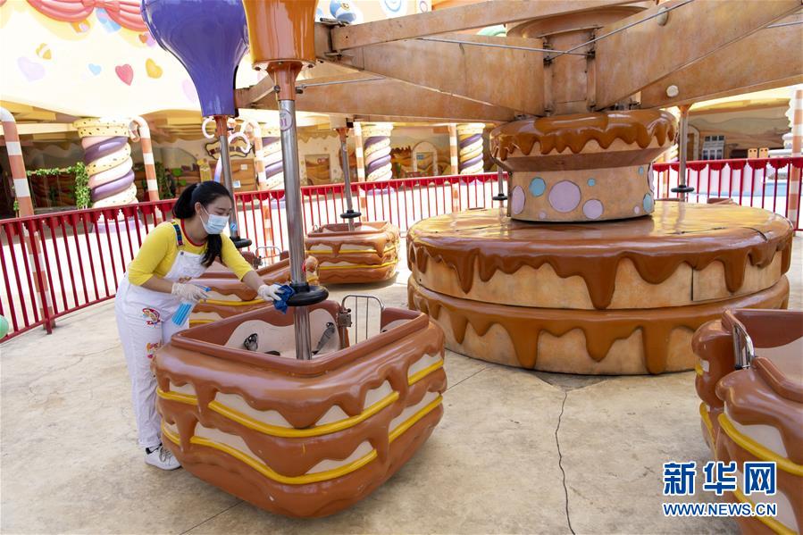 5月19日,工作人员对游乐设施进行消毒。 当日,湖北武汉欢乐谷重新开放。园区执行客流量管控,游客需通过网上预约才能进入,室内场馆暂不开放。 新华社记者 熊琦 摄