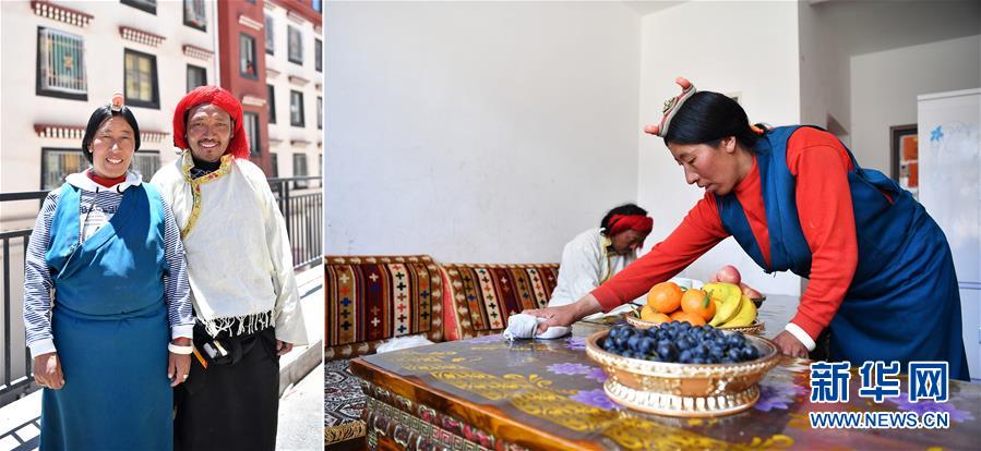 拼版照片:左图为西藏昌都市八宿县拥巴乡娜帕村村民布贡(右)和妻子益西琼措在安置点楼前;右图为在八宿县乃然易地扶贫搬迁安置点,益西琼措在家里打扫卫生。2018年,布贡一家人搬迁到乃然易地扶贫搬迁安置点,住进了三室一厅的新居。和布贡一家一样,八宿县拥巴乡、夏里乡、瓦乡的2000余名群众完成易地搬迁,开启美好的新生活(5月10日摄)。新华社记者 詹彦 摄