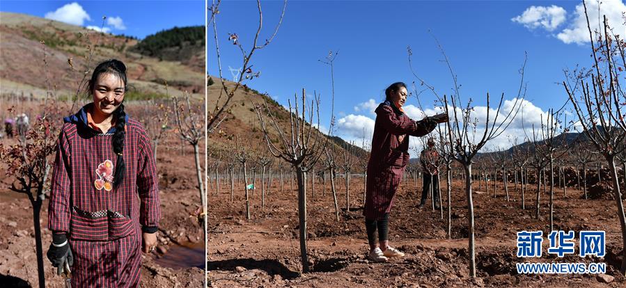 拼版照片:左图为西藏昌都市芒康县帮达乡毛尼村村民拉姆卓玛;右图为拉姆卓玛在芒康县林业产业扶贫苗圃基地忙碌。2020年,经朋友介绍,拉姆卓玛来到苗圃基地打工,每天有120元的收入。苗圃基地还吸纳了附近易地扶贫搬迁安置点的80多名群众稳定就业(5月5日摄)。新华社记者 詹彦 摄