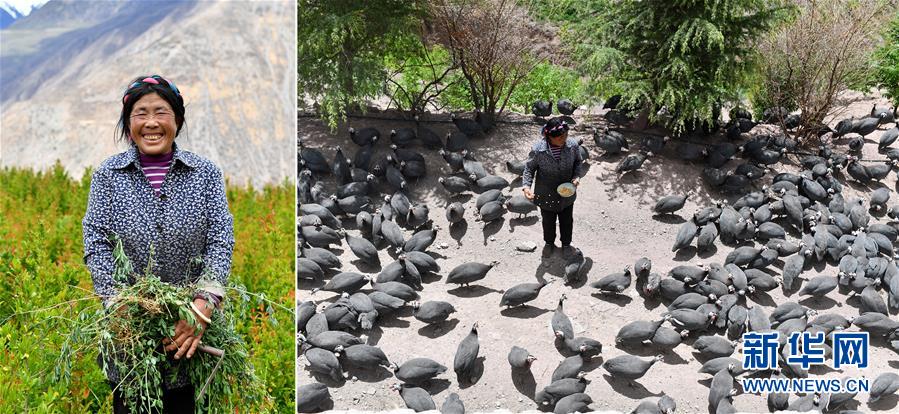 拼版照片:左图为西藏昌都市芒康县纳西民族乡加达村村民白姆;右图为白姆在芒康县纳西民族乡三江农民专业合作社喂鸡。白姆在三江农民专业合作社打工,主要负责喂鸡和喂牛,每月有3000元的收入(5月4日摄)。新华社记者 詹彦 摄