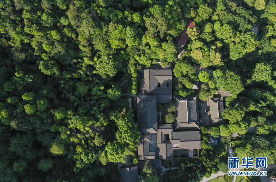 缙云寺掩映在绿树之中(5月18日摄 无人机照片)。 初夏时节,位于重庆市北碚区的缙云山国家级自然保护区绿意盎然,秀美如画。 新华社记者 刘潺 摄