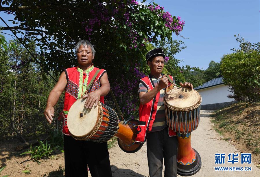 5月18日,云南省普洱市西盟县翁嘎科镇英力下村民族文化传承人岩恩(左)在展示制作的佤族象脚鼓。 云南省普洱市西盟佤族自治县翁嘎科镇英力下村民族文化传承人岩恩,从事手工艺制作16年,带领村里的残疾人、退伍军人从事佤族象脚鼓和木鼓等民间乐器制作,乐器产品远销泰国及周边地区,带动山寨群众脱贫增收。 新华社记者 杨宗友 摄