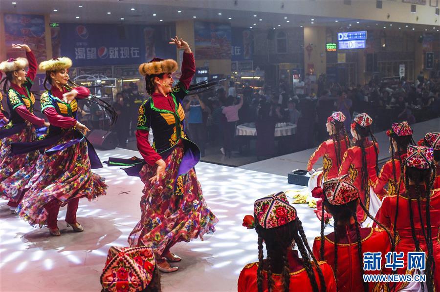 演员在新疆和田夜市环湖店表演(5月16日摄)。 5月中旬以来,新疆和田气候渐暖,当地旅游经济逐步复苏,笑迎八方游客。和田的夜市逐渐热闹起来,吸引不少游客前来打卡,品尝美食,欣赏歌舞。 新华社记者 王菲 摄