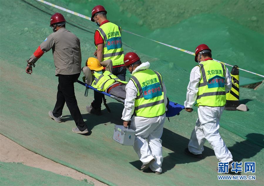 5月19日,工作人员在模拟演练救治施工现场受伤人员。 当日,“2020年度北京市轨道交通工程汛期突发事故综合应急演练”在地铁11号线西段03标首钢站施工现场举行。本次演练科目包括围护结构锚喷面渗漏水及脱落、自来水管线断裂、局部土体变形等,演练了汛期预警及响应、事故信息报告、抢险队伍调动、应急物资调配和现场救援等环节。 新华社记者 张晨霖 摄