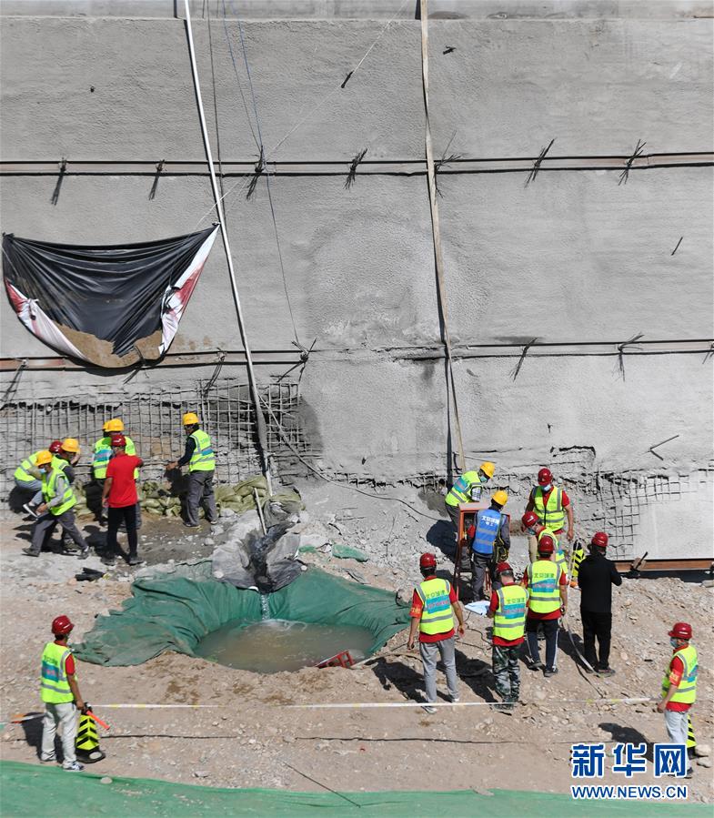 5月19日,工作人员在施工现场模拟进行紧急抢修。 当日,“2020年度北京市轨道交通工程汛期突发事故综合应急演练”在地铁11号线西段03标首钢站施工现场举行。本次演练科目包括围护结构锚喷面渗漏水及脱落、自来水管线断裂、局部土体变形等,演练了汛期预警及响应、事故信息报告、抢险队伍调动、应急物资调配和现场救援等环节。 新华社记者 张晨霖 摄