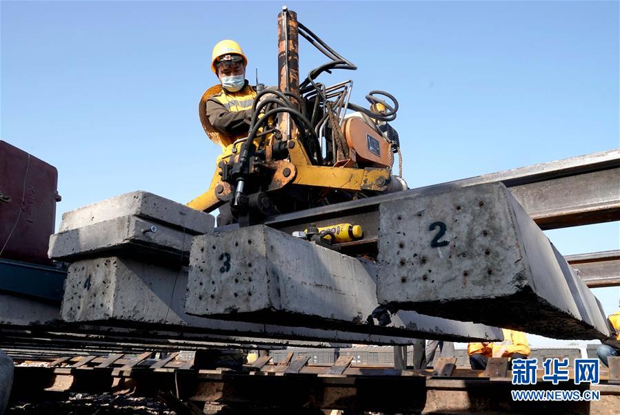 5月19日,新乡桥工段长垣重点维修车间的职工在放置道岔。新华社记者 李安 摄