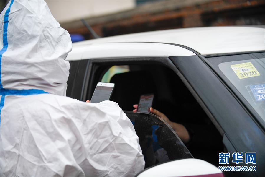 5月19日,在吉林省吉林市高新区一小区,社区工作人员为小区居民扫描健康码。新华社发(颜麟蕴 摄)
