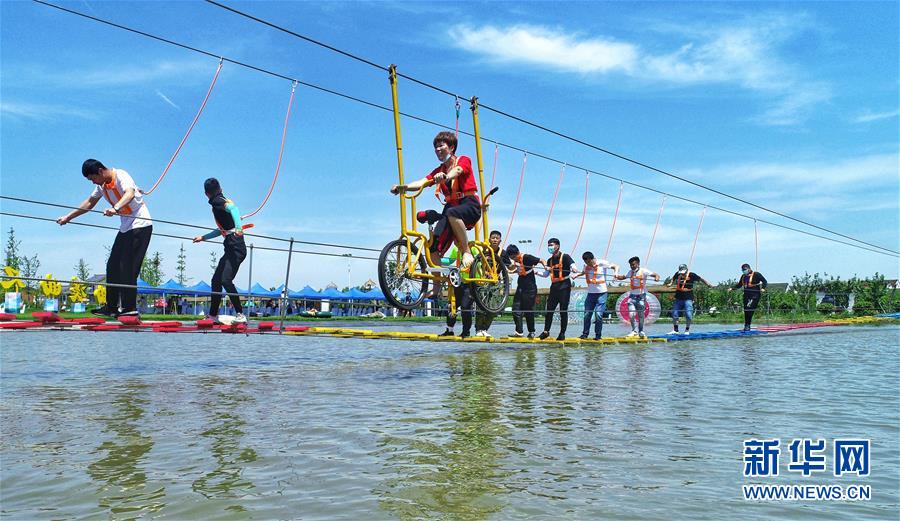 5月19日,在浙江省湖州市德清县钟管镇曲溪曲尺湾营地,游客体验“七彩飘逸桥”和“空中自行车”项目。 当日是中国旅游日。 新华社发(谢尚国 摄)