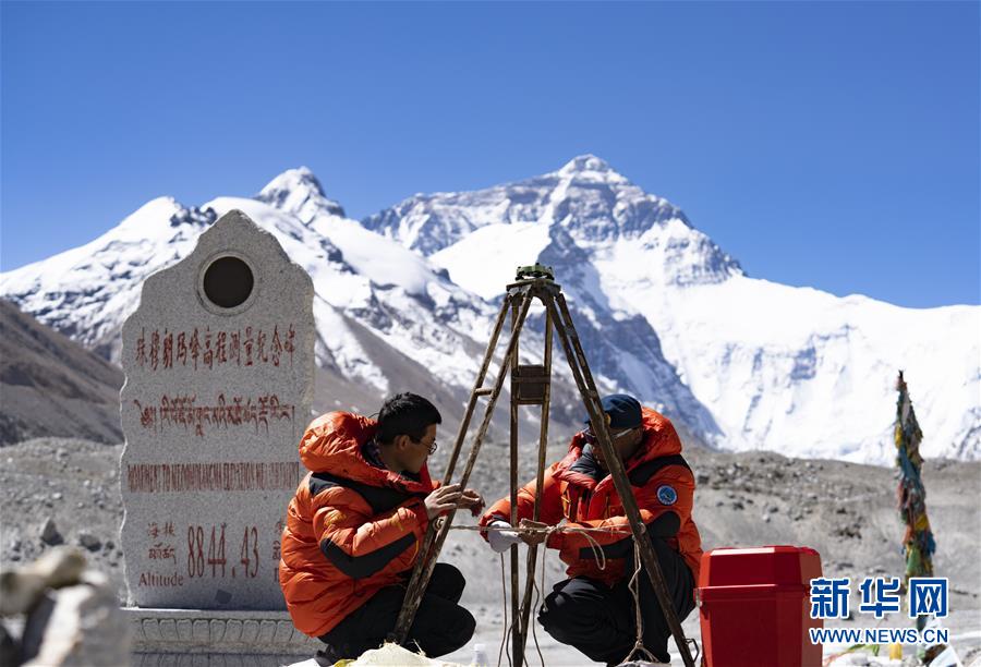 国测一大队队员在珠峰大本营附近测试设备(5月17日摄)。 新华社记者 普布扎西 摄
