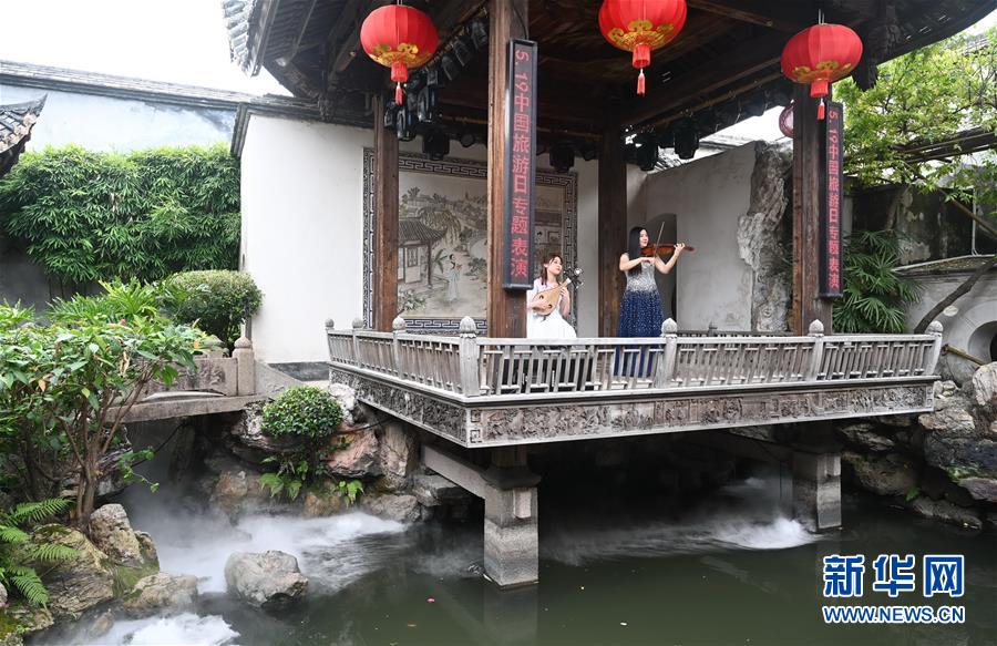 5月19日,工作人员在福州历史文化街区三坊七巷进行文艺表演直播。 当日是中国旅游日,福州推出“云游坊巷”专题直播活动,让各地游客通过网络“云游”福州古厝和坊巷等。 新华社记者 林善传 摄