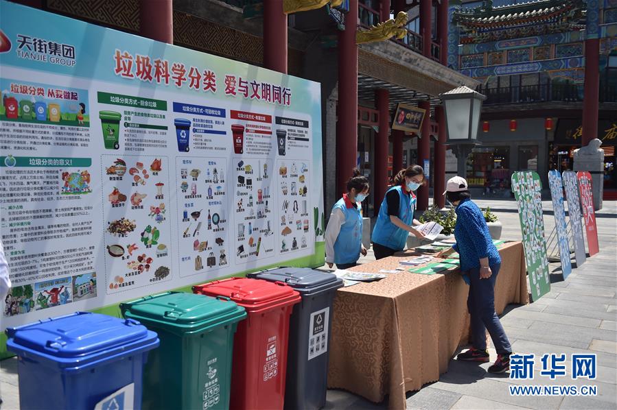 5月19日,一位游客在活动现场领取垃圾分类知识宣传手册。 当日是“中国旅游日”,北京天街集团在前门大街举行“垃圾科学分类 爱与文明同行”主题活动,宣传垃圾分类知识,引导游客文明出行,保护生态环境。 新华社记者 彭子洋 摄