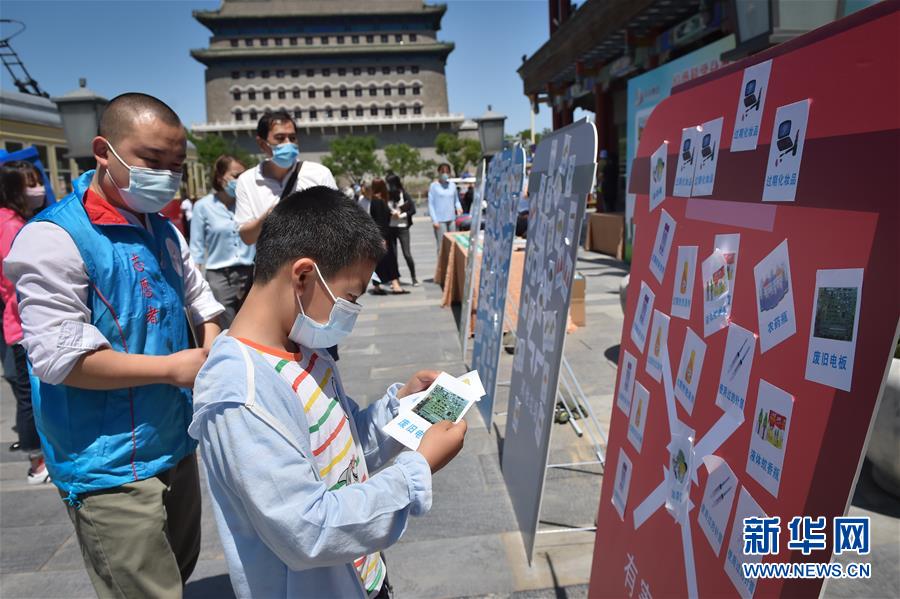5月19日,一名小游客准备将自己认为是有害垃圾的贴纸贴上展板。 当日是“中国旅游日”,北京天街集团在前门大街举行“垃圾科学分类 爱与文明同行”主题活动,宣传垃圾分类知识,引导游客文明出行,保护生态环境。 新华社记者 彭子洋 摄
