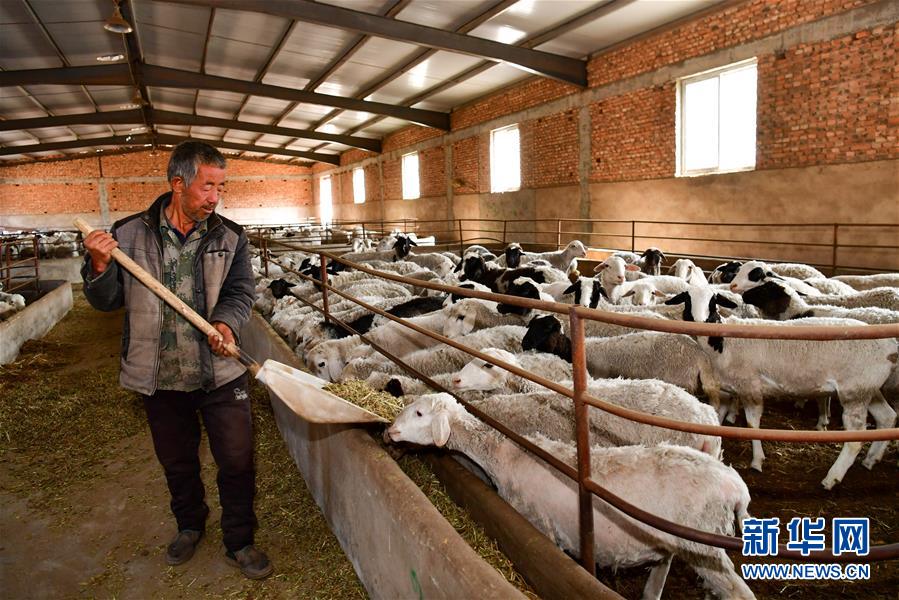 宋家沟村村民贺毛小在养殖合作社内喂羊(5月19日摄)。 新华社记者 曹阳 摄