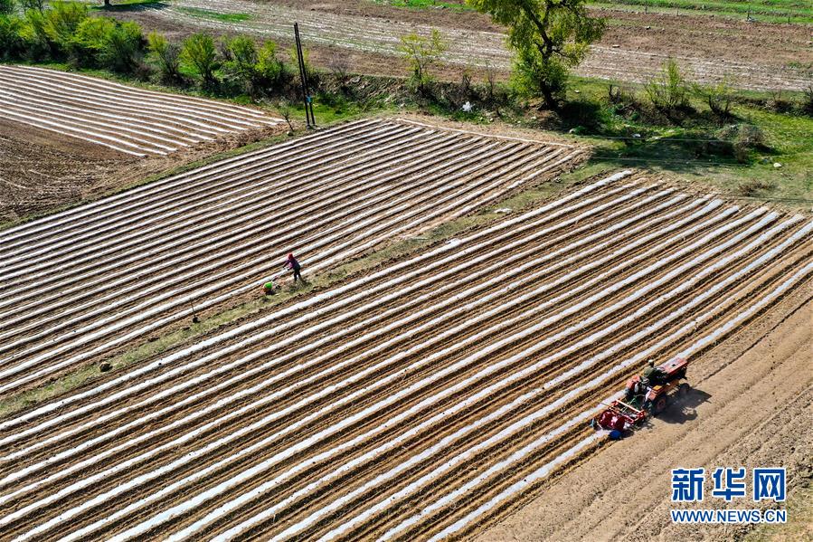 宋家沟村村民在种谷子(5月19日摄,无人机照片)。 新华社记者 曹阳 摄