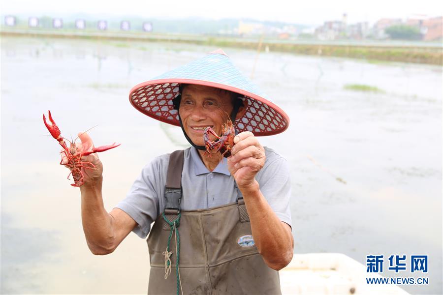 在广西南宁市上林县三里镇小龙虾水产健康养殖示范场,贫困户石黄珠展示小龙虾(5月18日摄)。新华社发(韦以念 摄)