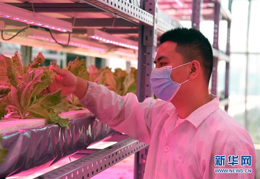 5月20日,在位于北京市海淀区的中国农业科学院国家农业科技创新园温室,工作人员检查在LED人工光照下生菜的生长状况。 复工复产以来,在位于北京市海淀区的中国农业科学院国家农业科技创新园,工作人员通过采用无土栽培、LED人工光栽培等技术,生产黄瓜、西红柿、生菜等蔬菜,继续供应周边商场超市。 新华社记者 任超 摄