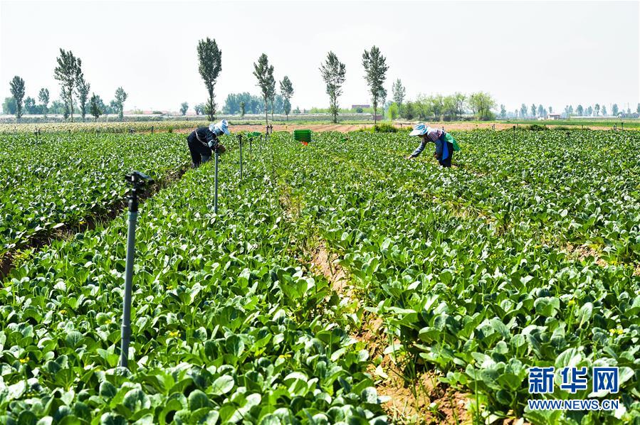 5月20日,在山西省清徐县南内道村,农民在采摘广东菜心。 连日来,山西省太原市清徐县南内道村供港蔬菜基地种植的广东菜心进入收获季,当地农民忙着收获蔬菜,基地内一派繁忙。 新华社发(柴婷 摄)